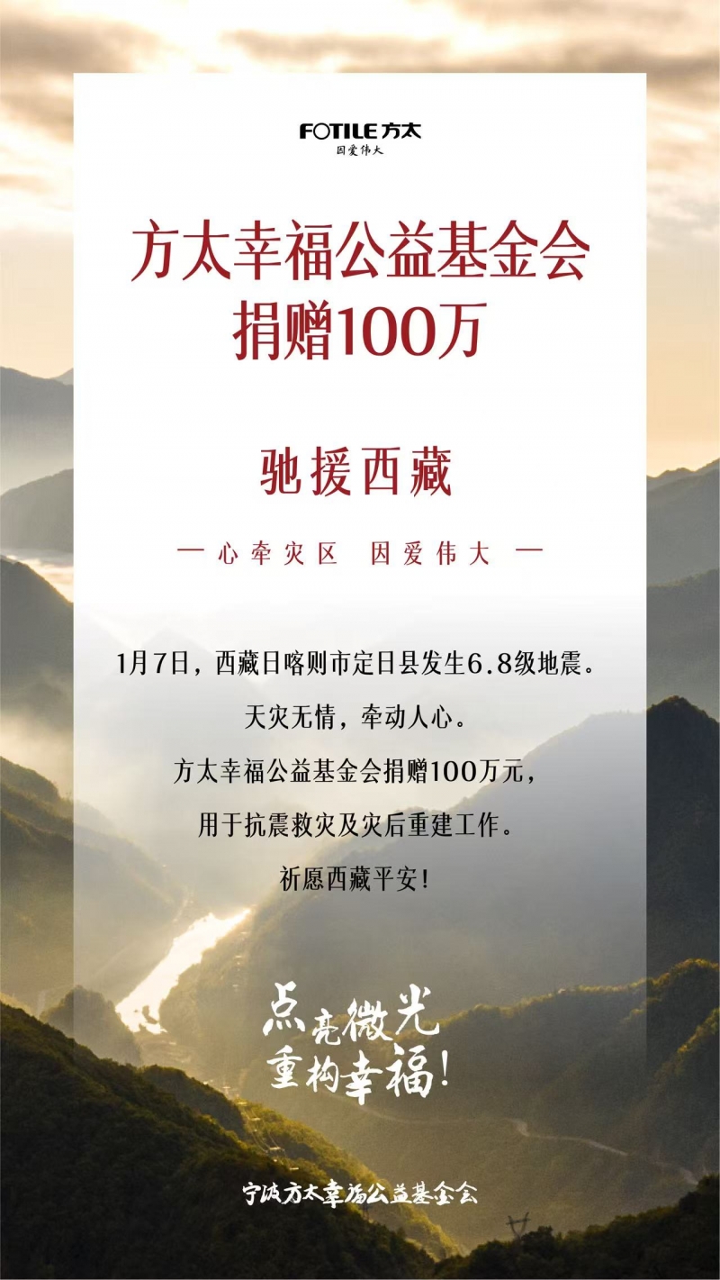 - 1 月 7 日,西藏日喀則市定日縣發生 6.8 級地震,災情的發生牽動著全國人民的心臟。為幫助震區人民抗震救災以及進行災后重建工作,方太幸福公益基金會捐贈 100 萬元,馳援