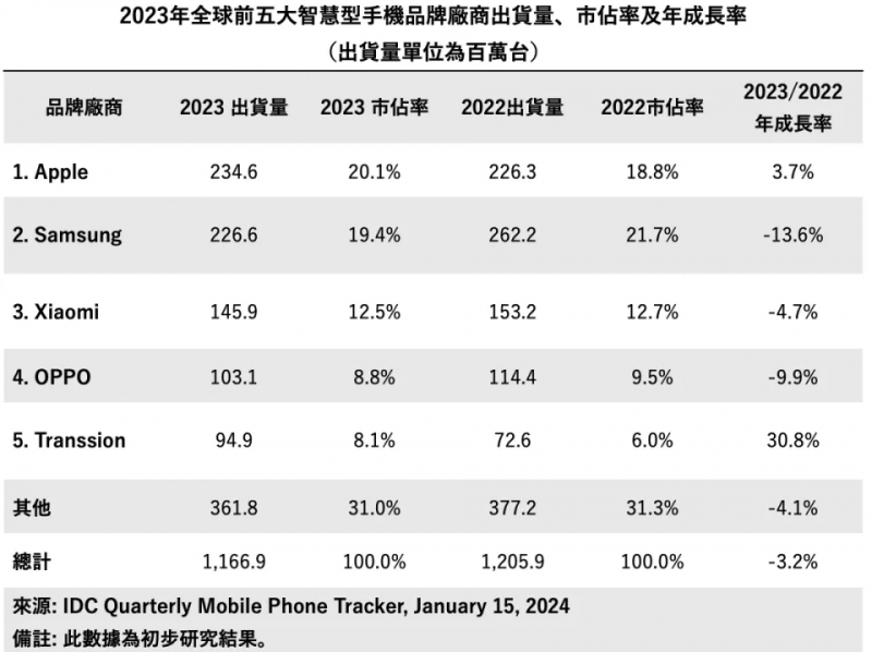 - 2023年全球智能機(jī)市場(chǎng):蘋果首次超越三星拿下第一