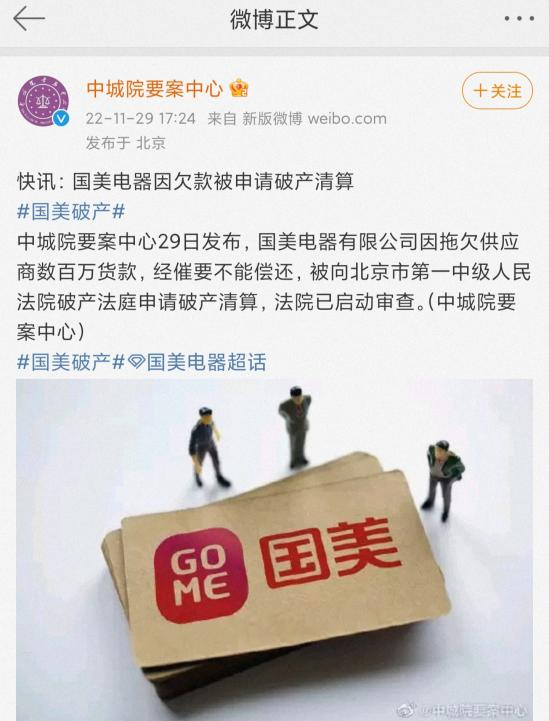 - 國美電器否認已被破產清算。 12月1日,“國美電器已被申請破產清算”登上熱搜。中城院要案中心官方微博于11月29日發布消息稱,國美電器有限公司因拖欠供