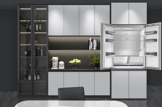 外觀層面,隱界Pro采用全嵌入式設(shè)計(jì)思路,冰箱本體可適配定制門板,用戶根據(jù)櫥柜材質(zhì)、色彩和紋理進(jìn)行匹配,安裝后冰箱正面與櫥柜齊平,視覺上融為一體。機(jī)身尺寸為高1925mm、寬892mm、深568mm(不含門板),總?cè)莘e600L。頂部配備全覆蓋式頂燈,開門后箱內(nèi)照明無死角。控制面板為全觸摸屏,溫度調(diào)節(jié)和模式切換通過觸控完成。