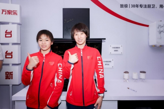 圖為全紅嬋、陳芋汐參加萬家樂X中國國家跳水隊(duì)?wèi)?zhàn)略合作簽約發(fā)布會