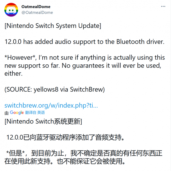 此外,OatmealDome還發(fā)現(xiàn)了12.0.0固件增加了對于藍牙音頻的支持,或許SwitchPro也將支持藍牙耳機等設備,彌補此前版本主機不支持藍牙耳機的遺憾。
