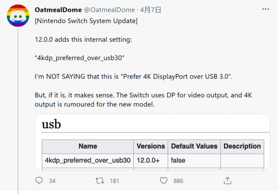 12.0.0版本固件中存在兩行設置參數(shù):“is_crda_fw_update_supported”和“4kdp_preferred_over_usb30”。 OatmealDome表示,“crda”就是“Cradle Aula”,而“Aula”則是任天堂新版底座的代號。第二行參數(shù)則表示switch將可以通過USB3.0(可能指Type-C)輸出4KDP協(xié)議信號。