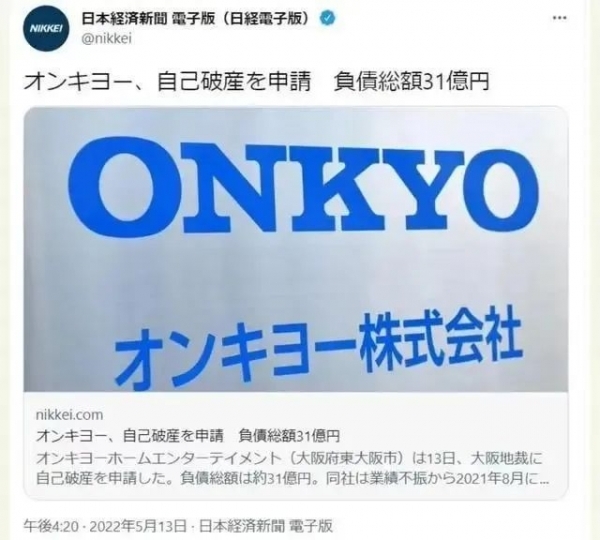 2022年5月,成立于1946年的日本老牌音響制造商安橋家庭娛樂(Onkyo Home Entertainment)宣布,已向大阪地方法院申請破產保護,接受了啟動破產程序的決定。負債總額約為31億日元。安橋的破產管理人律師表示,是因為“市場萎縮和(業務的)規模擴大,盈利出現惡化”。