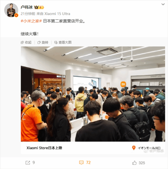 - 4月5日,小米品牌總經(jīng)理盧偉冰對外公布了一則消息:小米在日本開設的第二家直營店正式營業(yè),現(xiàn)場吸引了大量消費者前來體驗。從發(fā)布的圖片水印來看,這家新店位于埼玉縣川口市的永旺夢樂城。