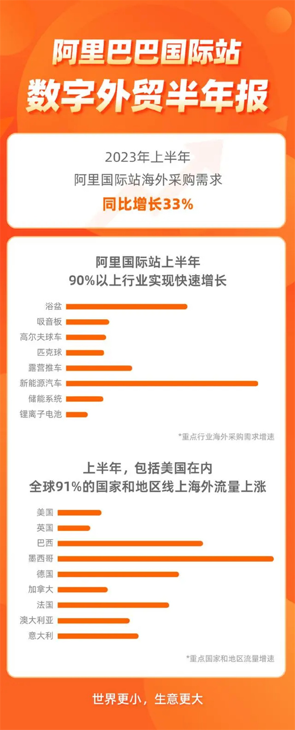 - 2023年上半年,阿里巴巴國際站上,海外線上需求同比增長33%。 日前,阿里國際站發(fā)布數(shù)字外貿(mào)半年報,顯示在各個出口行業(yè)、外貿(mào)市場,數(shù)字化已成當前最大趨勢。據(jù)悉,阿里國際站上半年90%行業(yè)線