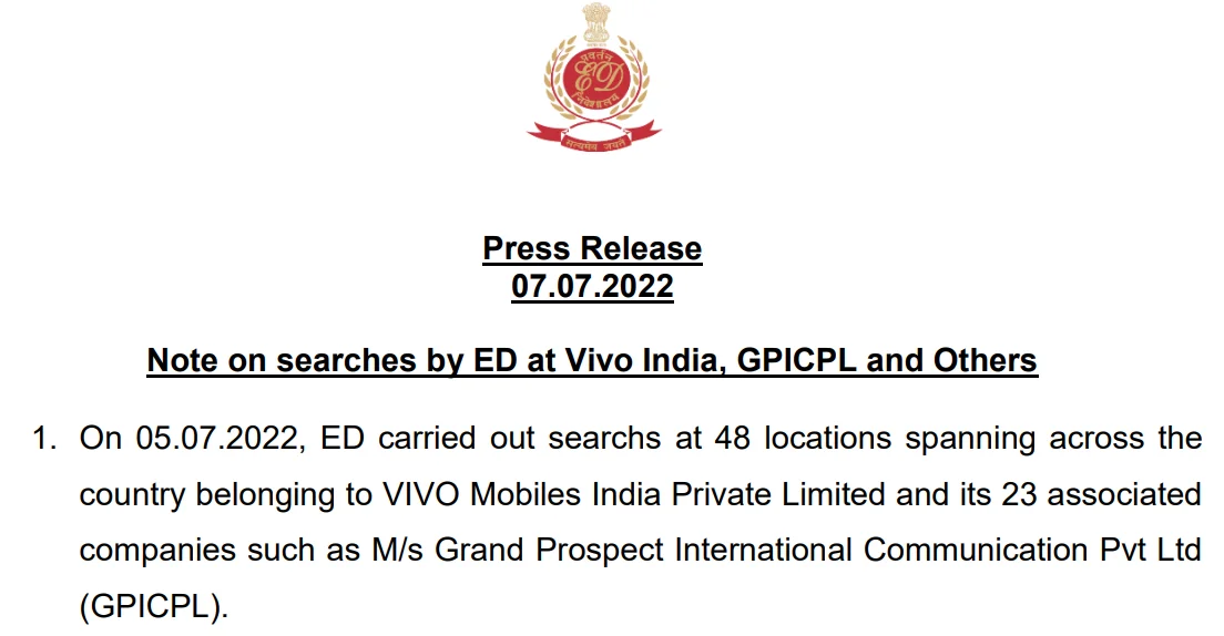 - 7月10日,觀察者網(wǎng)查詢印度打擊金融犯罪機(jī)構(gòu)“執(zhí)法局”(Enforcement Directorate)官網(wǎng)發(fā)現(xiàn),該機(jī)構(gòu)已凍結(jié)與vivo印度公司相關(guān)的119個(gè)銀行賬戶,涉及金額達(dá)46.5億盧比(約合人民幣3.9