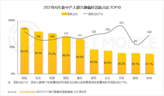 處于同一年齡時(shí)期的新中產(chǎn)人群較80、90后總體人群,在房產(chǎn)、汽車、出行等方面,具有更高的消費(fèi)需求,經(jīng)濟(jì)活躍度更為突出。他們同時(shí)擁有廣泛的興趣偏好,尤其在汽車、網(wǎng)購、辦公等領(lǐng)域具有較高群體傾向,突顯出他們家庭、事業(yè)多元成長的人生狀態(tài),豐富的消費(fèi)需求和廣泛的社交需要進(jìn)一步加深他們對于網(wǎng)購和社交的使用,而在視頻娛樂方面則有所放緩。