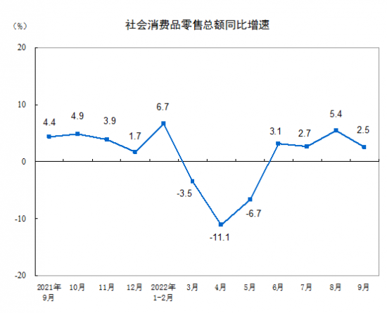 統計局:2022年9月份社會消費品零售總額增長2.5%