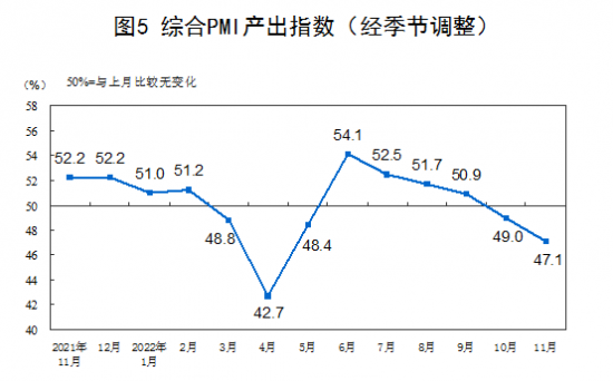 11月份,綜合PMI產出指數為47.1%,比上月下降1.9個百分點,低于臨界點,表明我國企業生產經營活動總體繼續放緩。