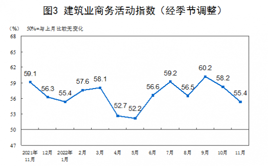 分行業看,建筑業商務活動指數為55.4%,比上月下降2.8個百分點。服務業商務活動指數為45.1%,比上月下降1.9個百分點。從行業情況看,郵政、貨幣金融服務、資本市場服務、保險等行業商務活動指數位于55.0%以上較高景氣區間;道路運輸、航空運輸、住宿、餐飲、文化體育娛樂等行業商務活動指數低于38.0%。
