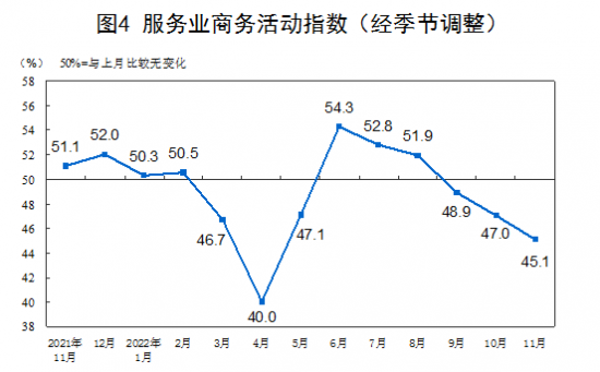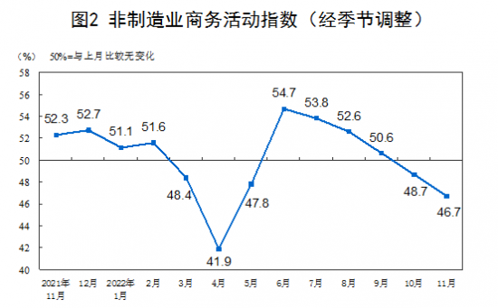 11月份,非制造業商務活動指數為46.7%,比上月下降2.0個百分點,連續兩個月低于臨界點,非制造業景氣水平走低。