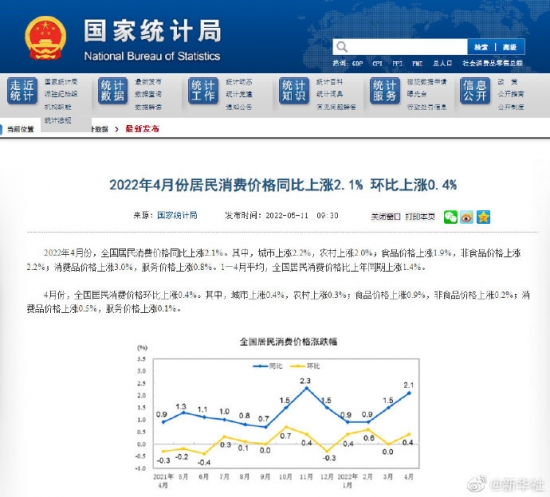 - 國家統計局:4月份居民消費價格同比上漲2.1%