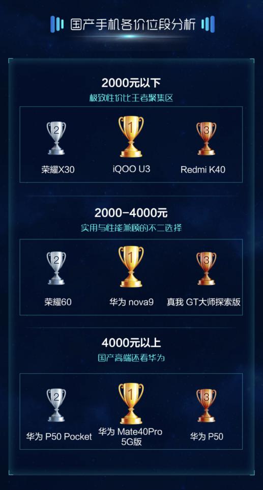 國產手機各價位段銷售方面,4000元以上國產手機依舊是華為的天下,盡管華為因為各種因素已經大不如前,但是國內其他品牌依舊很難撐起高端機的局面。而低端機型中iQOO U3、榮耀X30、Redmi K40位列前三。中高端價位段單品銷量TOP3為華為 nova9、榮耀60、真我 GT大師探索版。