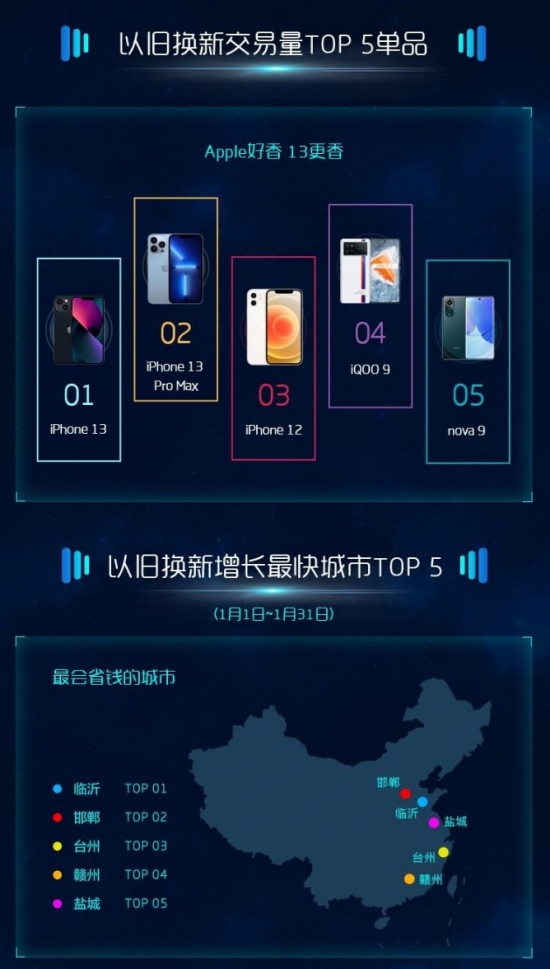 由于高端機方面,大部分份額被蘋果占據,所以在高端機型以舊換新方面,iPhone持續強勢。TOP5機型分別為iPhone 13、iPhone 13 Pro Max、iPhone 12、iQOO 9、華為nova 9,而在以舊換新增長方面,臨沂、邯鄲、臺州、贛州、鹽城領跑全國。