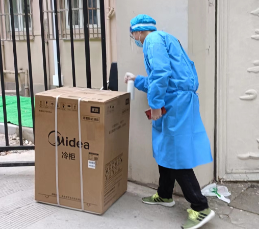 黃女士嘗試聯(lián)系了多家網(wǎng)購平臺以及電器賣場,都被告知無法送貨。經(jīng)朋友介紹,4月7日黃女士聯(lián)系到了蘇寧易購浦東一家門店的店長,經(jīng)過溝通后,該店長表示,次日便可安排送貨。第二日下午,身穿防護(hù)服的蘇寧易購物流人員,將冰箱送到了黃女士小區(qū)門口,對貨品進(jìn)行消毒后通知黃女士下樓取件。