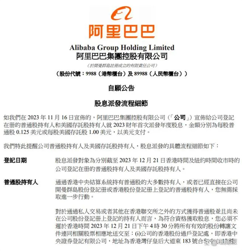 - 確定了,阿里將派發25億美元年度股息。 今年11月16日,阿里巴巴集團在公布截至2023年9月30日止季度業績時,一并披露了首次派發2023財年年度股息的計劃。將以每股普通股0.125美元或每股美