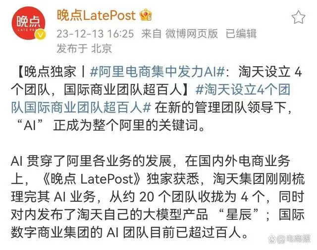 - 阿里巴巴正在全面發力AI領域,迎接AI電商時代的到來。 據晚點LatePost獨家消息,阿里巴巴旗下淘天集團和國際數字商業集團都已經建立了完整的AI團隊。 具體來說,淘天集團將原本負責AI