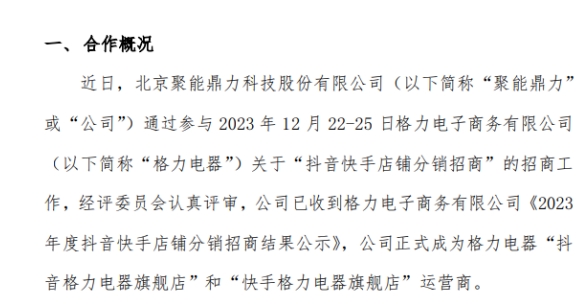 - 聚能鼎力中標成為“抖音格力電器旗艦店”、“快手格力電器旗艦店”運營商