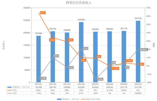 - 23日晚,阿里巴巴公布了2022年第四季度的業績報告。報告顯示,其第四季度營收同比增長2%至2477.56億元,凈利潤為457.46億元,同比增長138%,主要由于數字媒體及娛樂分部相關的商譽減值減少224.27