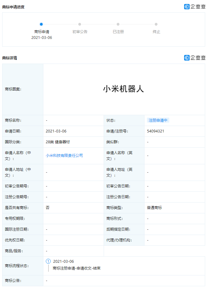 小米關聯公司申請“小米機器人”商標
