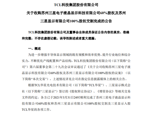【劃重點(diǎn)】: 4月1日晚間消息,TCL科技公告,公司收購(gòu)蘇州三星電子液晶顯示科技有限公司60%股權(quán)及蘇州三星顯示有限公司100%股權(quán)交割完成。蘇州華星技術(shù)及蘇州華星顯示的系統(tǒng)交接基本完成,管理已全部