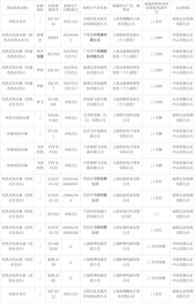 - 9 月 24 日,上海市市場監督管理局網站公布 2024 年上海市快熱式電熱水器質量監督抽查結果。近期,該局對本市快熱式電熱水器產品質量進行抽查,20 批次中有 2 批次不合格。實體銷售 2 批次有