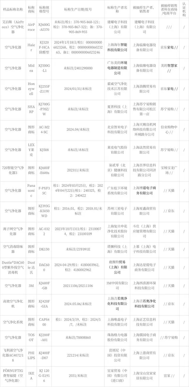 - 9 月 24 日,上海市市場監督管理局官網公布 2024 年上海市空氣凈化器產品質量監督抽查結果。近期,上海市市場監督管理局對本市空氣凈化器產品質量進行抽查,共抽 20 批次,1 批次不合格。生產
