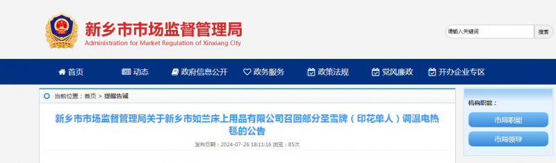 - 新鄉市如蘭床上用品有限公司召回部分圣雪牌(印花單人)調溫電熱毯