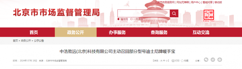- 中浩致遠(北京)科技有限公司主動召回部分型號迪士尼牌暖手寶 中浩致遠(北京)科技有限公司按照《消費品召回管理暫行規定》的要求,向北京市市場監督管理局報告了召回計劃,主動召回2023年10