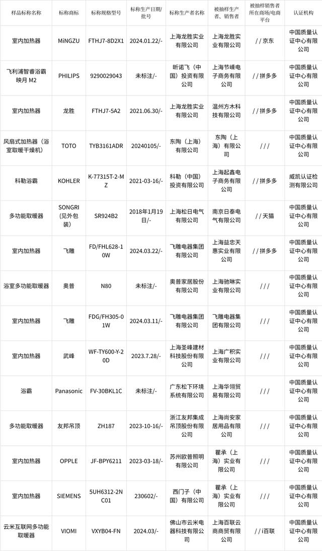 - 2024年上海市浴霸(暖風機)產品質量監督抽查結果