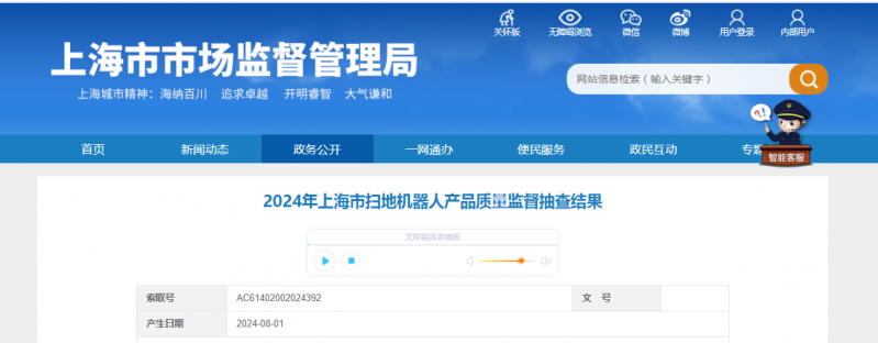 - 2024年上海市掃地機器人產品質量監督抽查結果