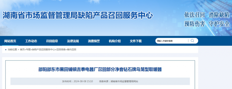 - 湖南邵陽邵東市黑田鋪鎮吉泰電器廠召回部分凈音鉆石牌鳥籠型取暖器