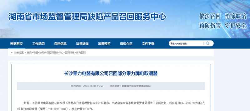 - 據湖南省市場監督管理局缺陷產品召回服務中心網站8月8日消息,日前,長沙乘力電器有限公司按照《消費品召回管理暫行規定》的要求,主動向湖南省市場監督管理局報告了召回計劃,將自即日起,召回2