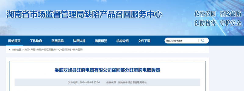 - 據湖南省市場監督管理局缺陷產品召回服務中心網站8月8日消息,日前,雙峰縣旺府電器有限公司按照《消費品召回管理暫行規定》的要求,主動向湖南省市場監督管理局報告了召回計劃,將自即日起,召