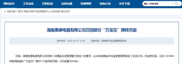 - 湖南惠康電器有限公司召回部分“萬寶花”牌轉頁扇