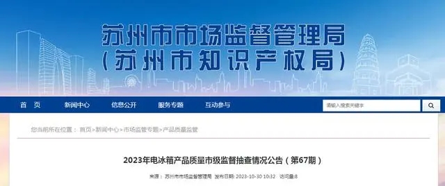 - 江蘇省蘇州市市場監督管理局發布2023年電冰箱產品質量市級監督抽查情況公告