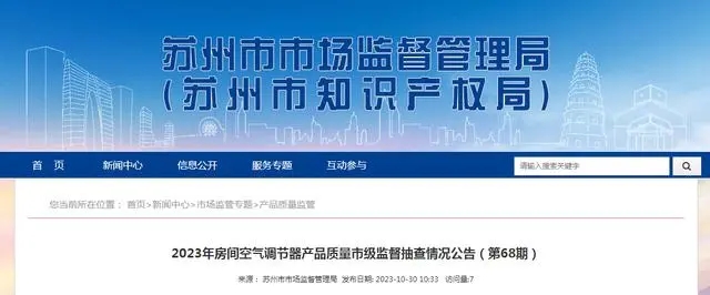 - 10月30日,江蘇省蘇州市市場監督管理局網站發布2023年房間空氣調節器產品質量市級監督抽查情況公告(第68期)。公告稱,2023年2季度,蘇州市市場監督管理局委托鑒衡巍德誼(廣東)檢測認證有限公