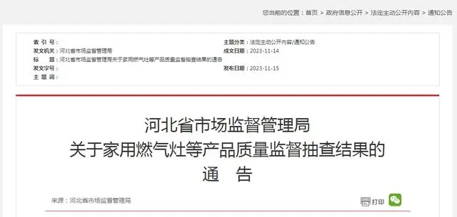 - 2023年11月15日,河北省市場監督管理局網站發布關于家用燃氣灶等產品質量監督抽查結果的通告。 據通告,為進一步加強河北省產品質量安全監管,切實維護消費者合法權益,河北省市場監督管理