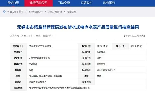- 無錫市市場監督管理局發布儲水式電熱水器產品質量監督抽查結果