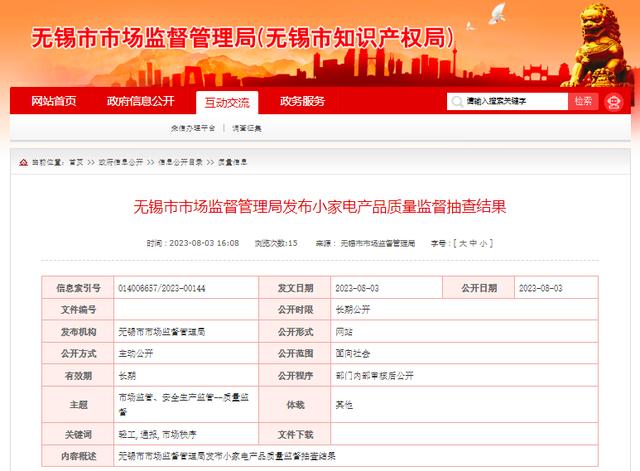 - 無錫市市場監督管理局發布小家電產品質量監督抽查結果