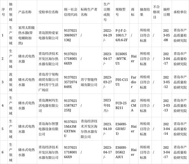 - 青島市市場監管局抽查:6批次儲水式電熱水器產品均合格