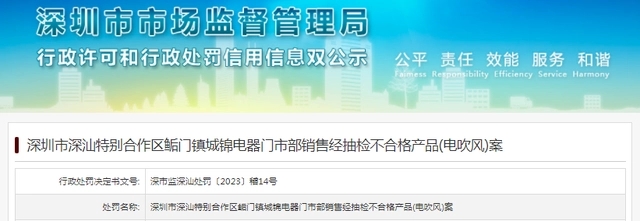 - 近日,深圳市市場監督管理局深汕監管局公布一條行政處罰信息,涉及深圳市深汕特別合作區鲘門鎮城錦電器門市部銷售經抽檢不合格產品(電吹風)案。具體信息如下: