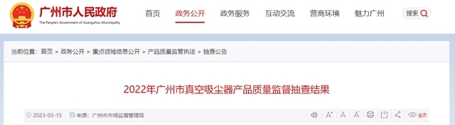 - 廣州市市場監督管理局抽查5批次真空吸塵器產品 不合格1批次