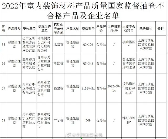 - 近日,國家市場監督管理總局發布2022年室內裝飾材料產品質量國家監督抽查情況通報。本次在流通領域抽查11個省(市)85家企業生產的126批次智能坐便器產品,發現4批次產品不合格,涉及:標稱柏瑞