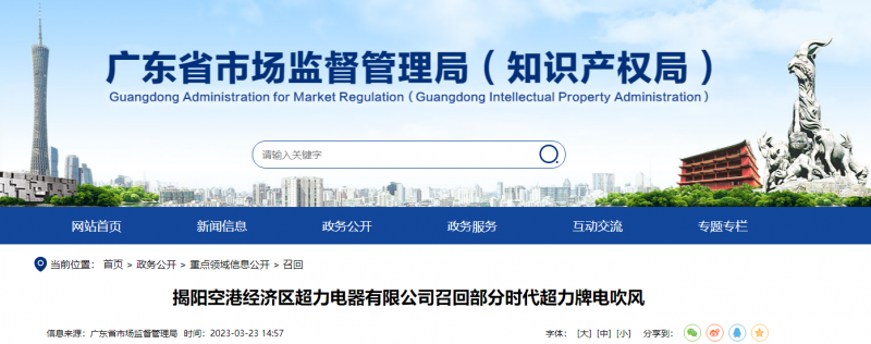 - 據廣東省市場監督管理局網站2023年3月23日消息,日前,揭陽空港經濟區超力電器有限公司按照《消費品召回管理暫行規定》的要求,主動向廣東省市場監督管理局報告了召回計劃,將自即日起,召回2020