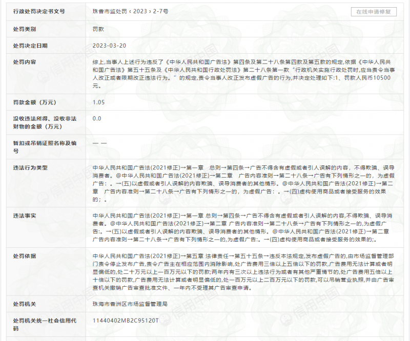 - 據信用中國顯示,近日,金稻美容儀關聯公司珠海金稻電器有限公司因廣告違法行為,被珠海市香洲區市場監督管理局罰款1萬余元。 違法事實顯示,當事人違反了廣告法中“廣告不得含有虛假
