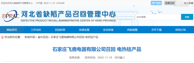 - 石家莊飛鹿電器有限公司召回電熱毯產品