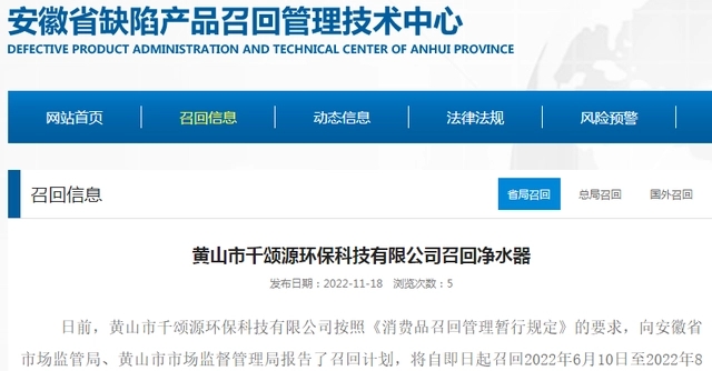 - 據安徽省缺陷產品召回管理技術中心網站11月18日消息,日前,黃山市千頌源環保科技有限公司按照《消費品召回管理暫行規定》的要求,向安徽省市場監管局、黃山市市場監督管理局報告了召回計劃,