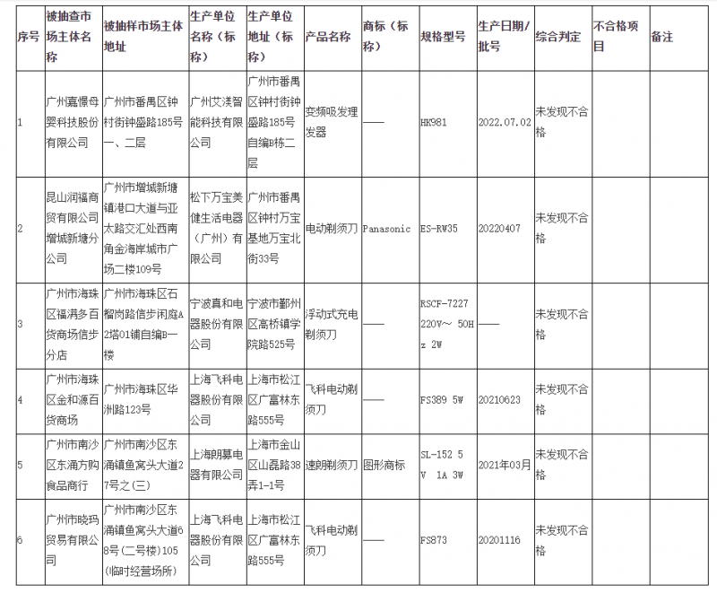 - 2022年廣州市剃須刀、電推剪及類似器具產品質量監督抽查結果